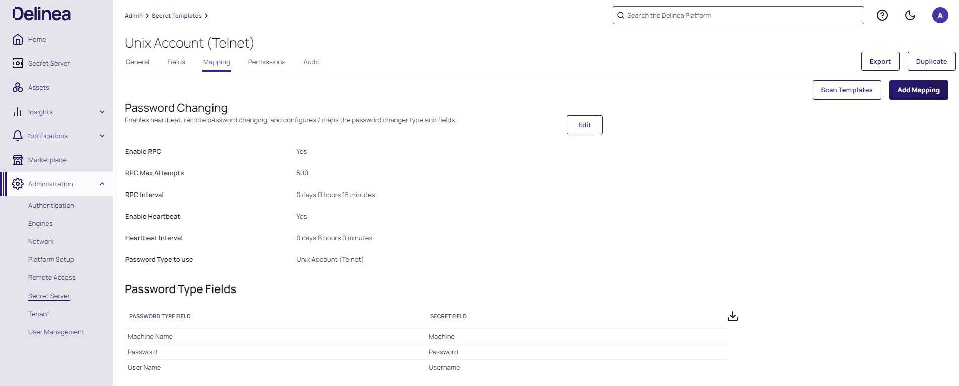 Select a Unix Account (Telnet) secret template and then click the Mapping tab.