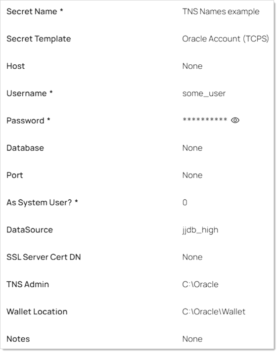In this example, jjdb_high or jjdb_low are both aliases. We would choose one, say jjdb_high, and paste it into the DataSource field on my secret. I would include C:\Oracle in the TNS Admin field. My secret would appear as in the following screenshot: