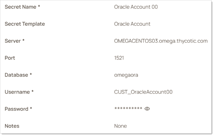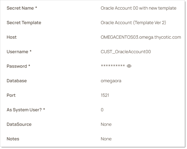 Oracle Account (Template Ver 2) is the closest equivalent to the original Oracle Account template. It does not support Oracle TCPS, but it does use the Oracle Managed Data Access NuGet library. The fields on this secret template are the same as in the original Oracle Account template with a few exceptions. We added two new fields, the DataSource and “As System User” fields described above. Additionally, the “Server” field is called “Host” in the new template to more closely match the terminology in Oracle’s connection string.