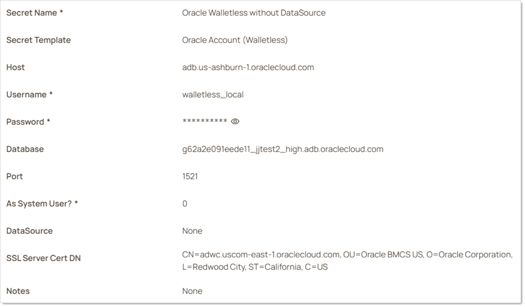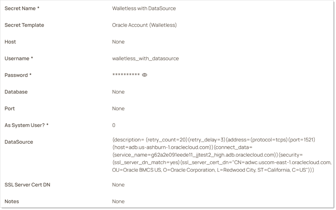 The fields on this template are the same as Oracle Account (Template Ver 2) with the addition of the “SSL Server Cert DN” field, which can be found in the TLS connection string. Refer to documentation on your specific Oracle database about how to enable walletless connections, as well as how to obtain the TLS connection string to fill in fields on this secret template.