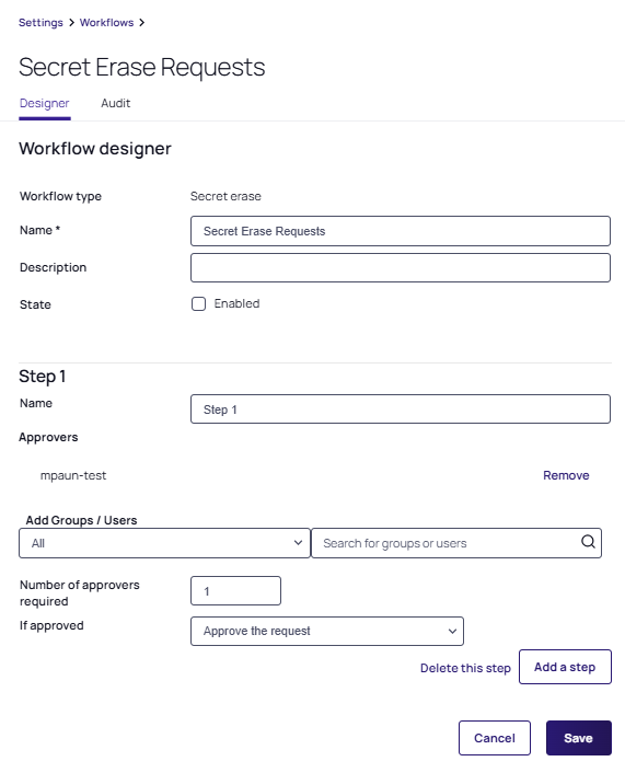 This is where you set up an erase secrets request. When you complete the process, the access request is sent to the users or user group you designated earlier for approval.