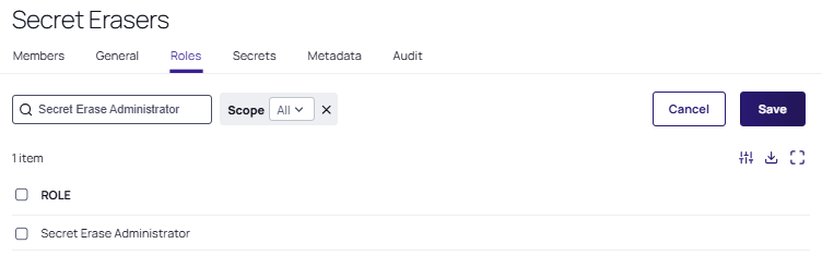 In the Scope drop-down menu select All, so that all permissions available are shown, search for Erase Secret, select it, and click Save.
