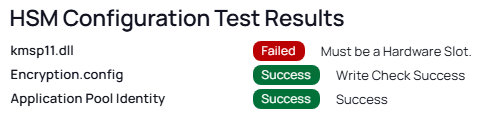 Examine the output of the test by looking for your CNG provider's name for your HSM and verifying the result. We recommend running this test using the same account as the application pool Verify Privilege Vault is using. If the testing tool reports errors, consult your HSM's vendor or documentation for resolution.