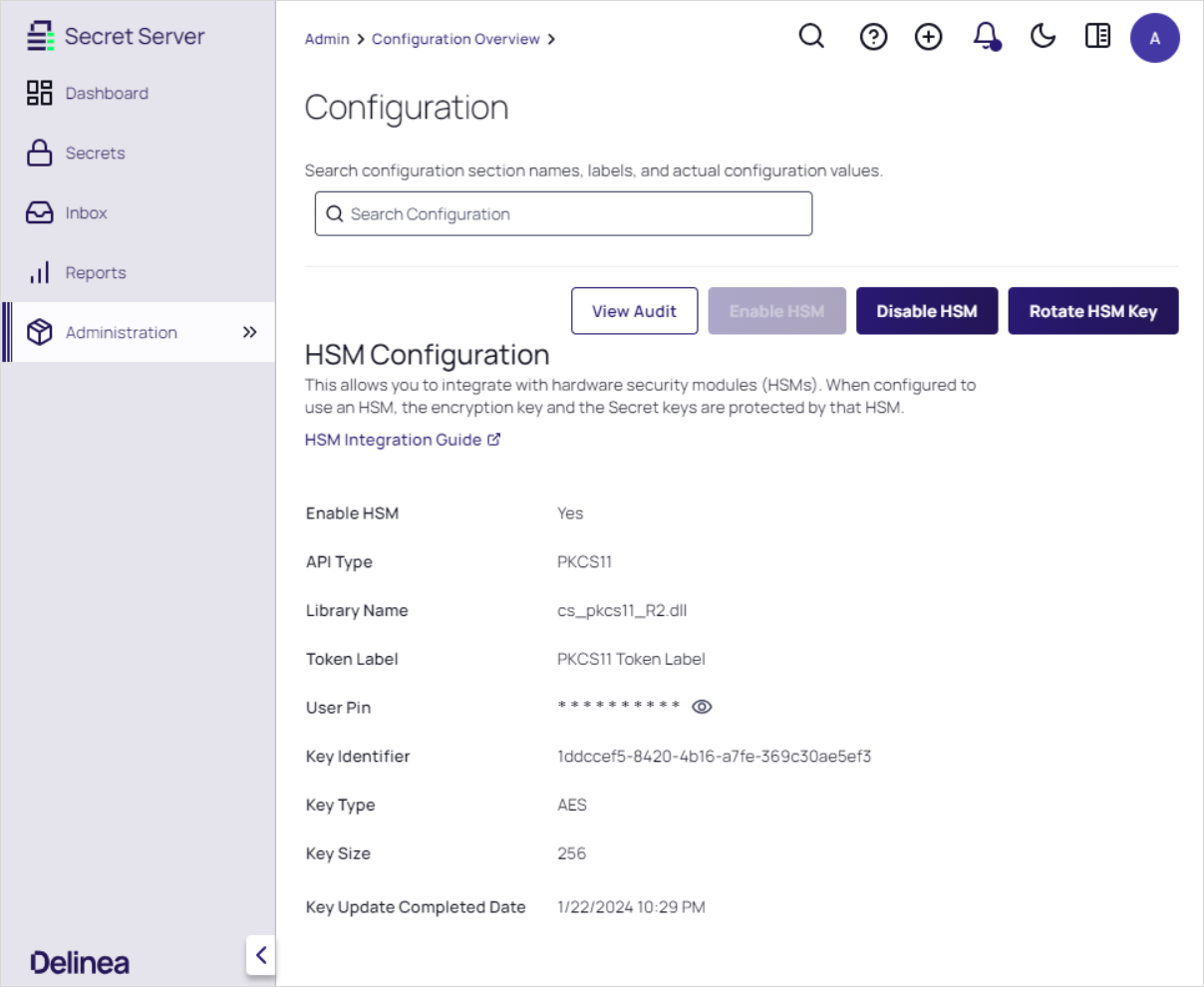 If HSM is enabled, Verify Privilege Vault can now rotate the HSM key to ensure the secret keys are always protected by an HSM key. Rotating the HSM key only decrypts the secret keys and then re-encrypts them with the new HSM key. We recommend performing a secret key rotation after the HSM key has been rotated.
