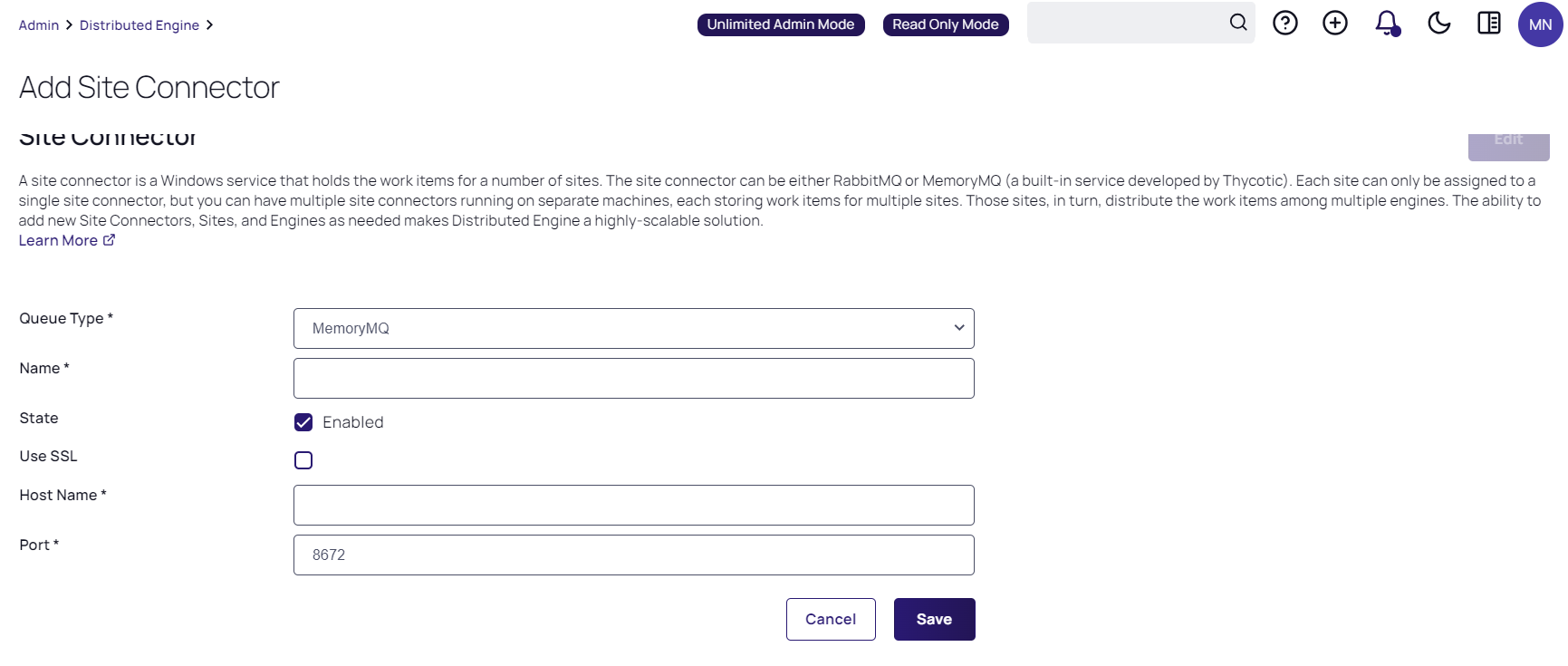 On the Add Site Connector page, select either RabbitMQ or MemoryMQ in the Queue Type drop-down list. If at least 3 RabbitMQ nodes have been set up in a clustering setup, choose MemoryMQ (see the Cluster section in the RabbitMQ Helper documentation for more information):