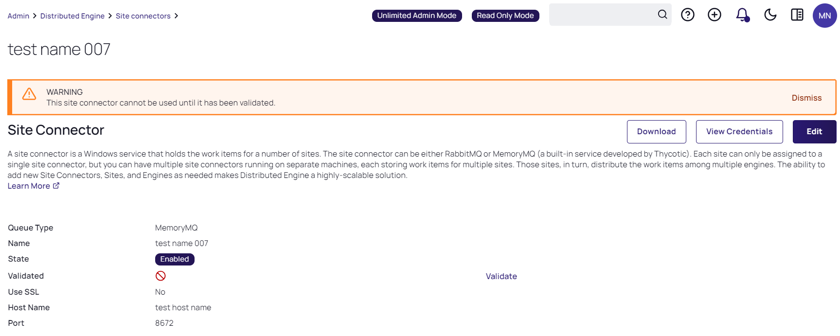 After the site connector is created, click the site connector's link. The Site Connector Details will page appear: