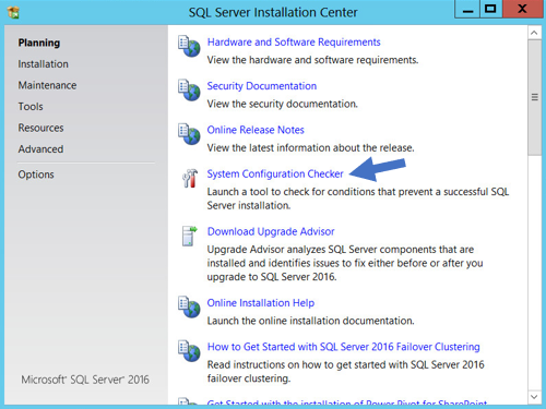 Click the System Configuration Checker link. This runs a tool that checks for conditions on your server that could prevent SQL Server from installing.