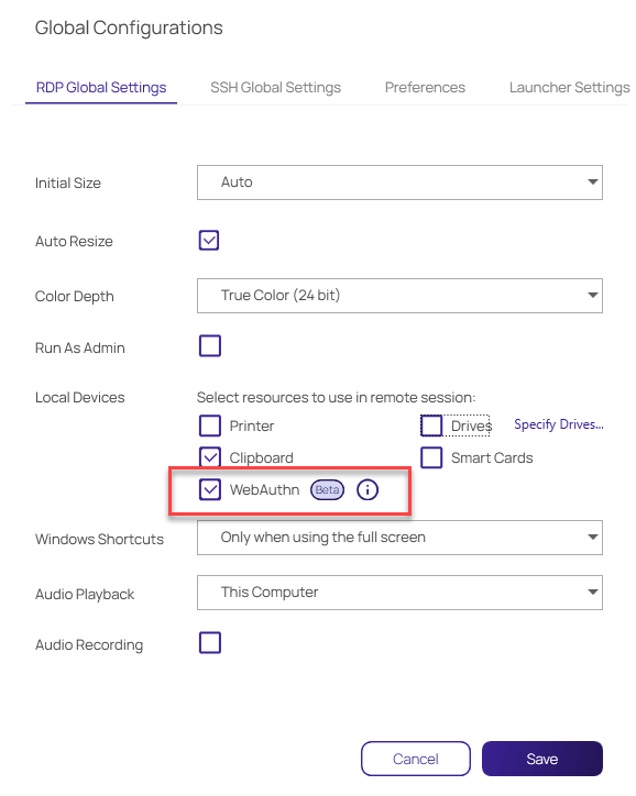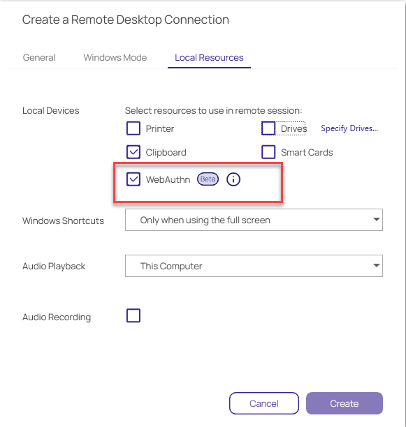 WebAuthn enables secure passwordless authentication using hardware security keys, biometrics or platform authenticators during remote RDP sessions. This feature is in beta and may change in future updates.