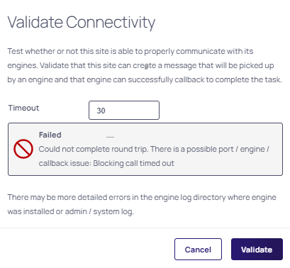 In the Site section, click Validate Connectivity. The Validate Connectivity popup appears.