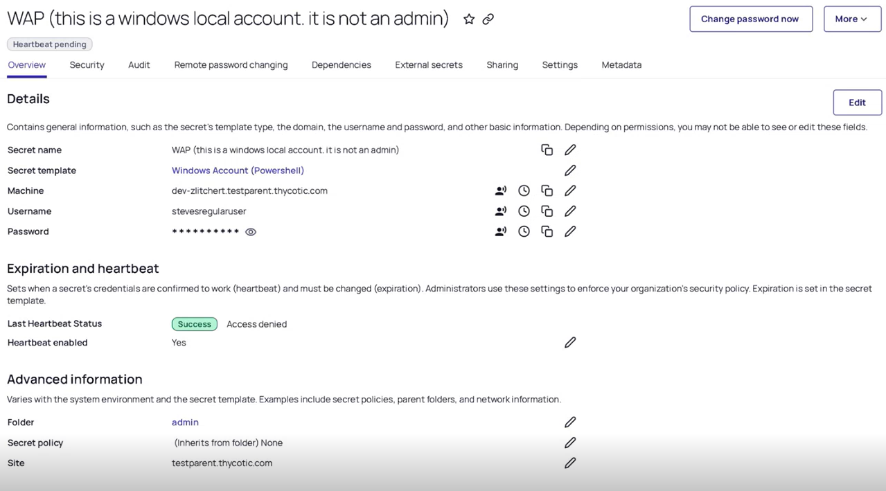 When a password is changed manually or by RPC, a Heartbeat is queued to determine if the credentials in the secret are valid. The heartbeat status shows Pending while the process executes. When the heartbeat completes the status will change to either Success or Failure. Success means the credentials in the secret are valid.